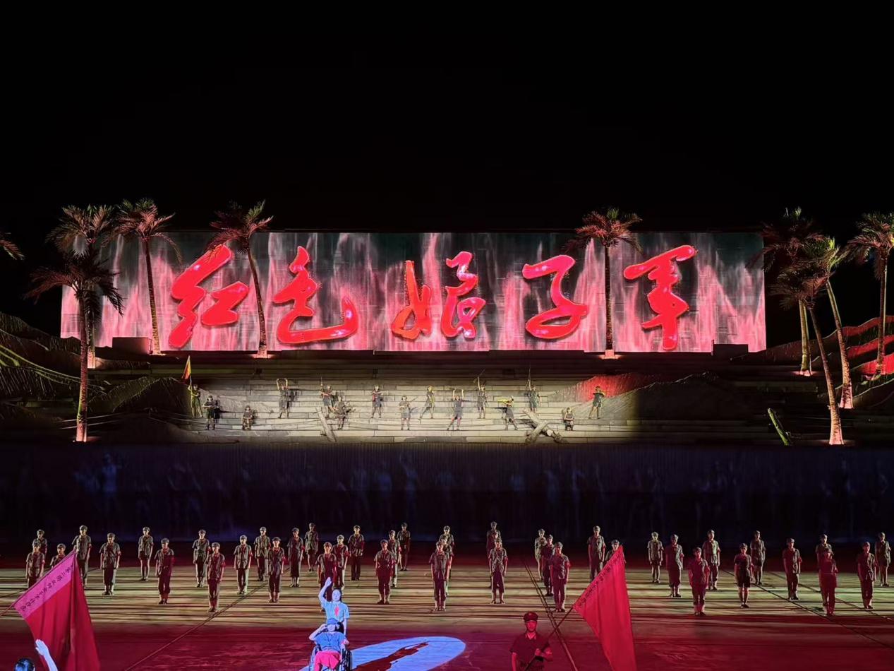 调研过程中,讲解员继续介绍了娘子军支援前线、思想动员、练兵学习等历史细节。那段军民同心、艰苦奋斗的岁月,让师生们仿佛身临其境,深刻体会到革命成果的来之不易。2025级研究生管靖锴参观后深受触动:“真的很难想象,她们当年就是在这样的条件下坚持下来的,我一下子明白了‘艰苦卓绝’这个词的重量。”同班的孙玮彤同学分享道:“每一位女英雄的名字和历史都值得被记住,她们的故事让我思考自己该如何担当起今天的责任。”当晚的大型椰海实景演出《红色娘子军》震撼开幕。演出以真实的椰林为幕布,借助精湛的舞蹈演绎、沉浸式的裸眼3D技术与可移动的观演席,生动再现了那段热血澎湃的革命岁月。娘子军战士们为家国命运冲锋陷阵、守望相助的动人故事,引得在场师生频频举起手机记录,掌声不断,更有人热泪盈眶。2025级研究生刘佳音看完演出后感慨:“我一想到她们是和我年纪相仿、甚至更小的女孩子,却要上战场经历流血牺牲,就觉得很难过,觉得她们好伟大。”同班同学郭俊言则表示:“这场实景演出太震撼了,我深深感到,身处和平年代的我们,更不能忘记先烈们是用怎样的牺牲才换来了今天的幸福”。