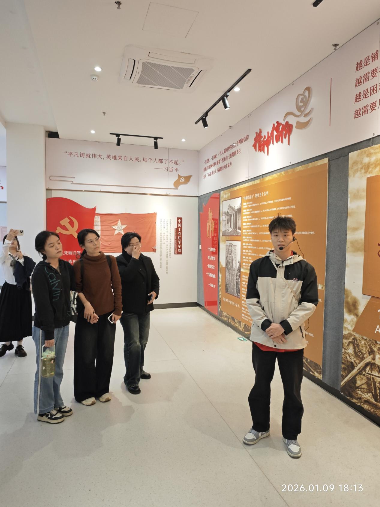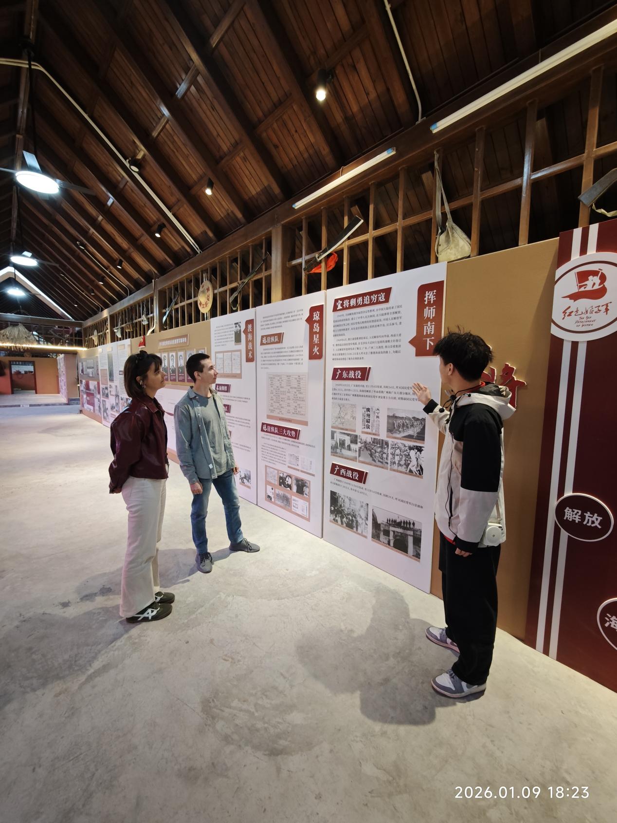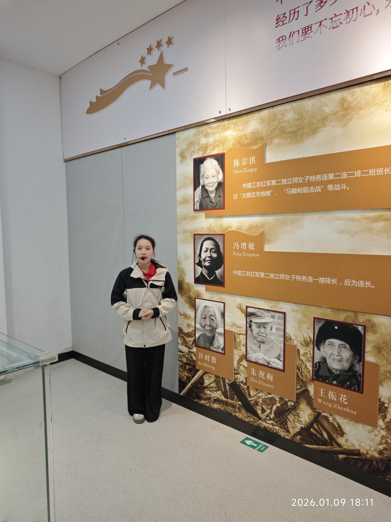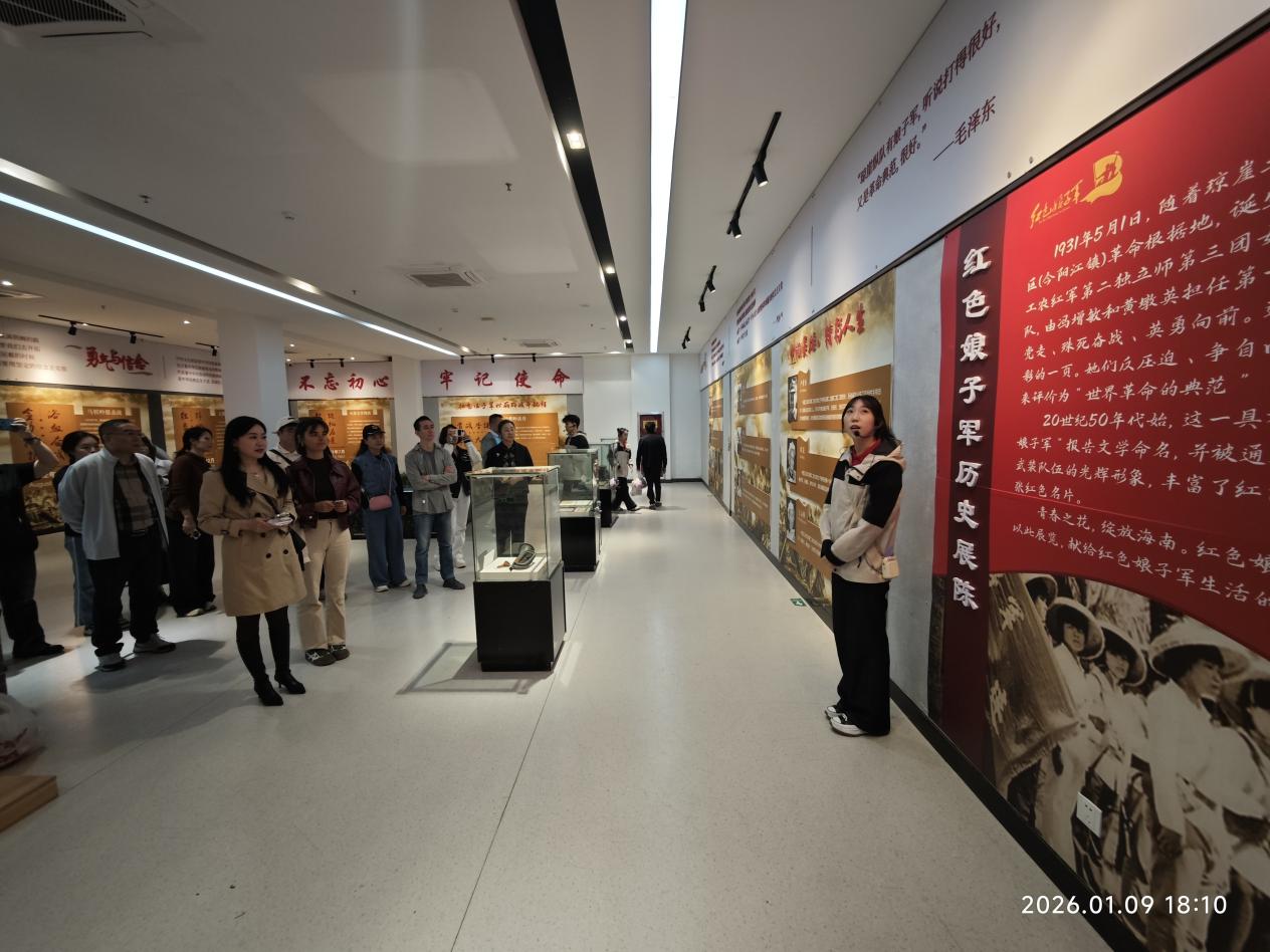 活动中,师生一行首先参观了红色娘子军党史展览馆。我院三位实习本科生凭借扎实的俄语功底和丰富的历史知识,为师生提供了生动详实的双语讲解。她们结合馆藏文物、历史影像与文献资料,将红色娘子军的革命历程娓娓道来,既展现了出色的语言应用能力与跨文化服务素养,也让在场师生深刻体悟到巾帼英雄的奋斗精神与家国情怀。
