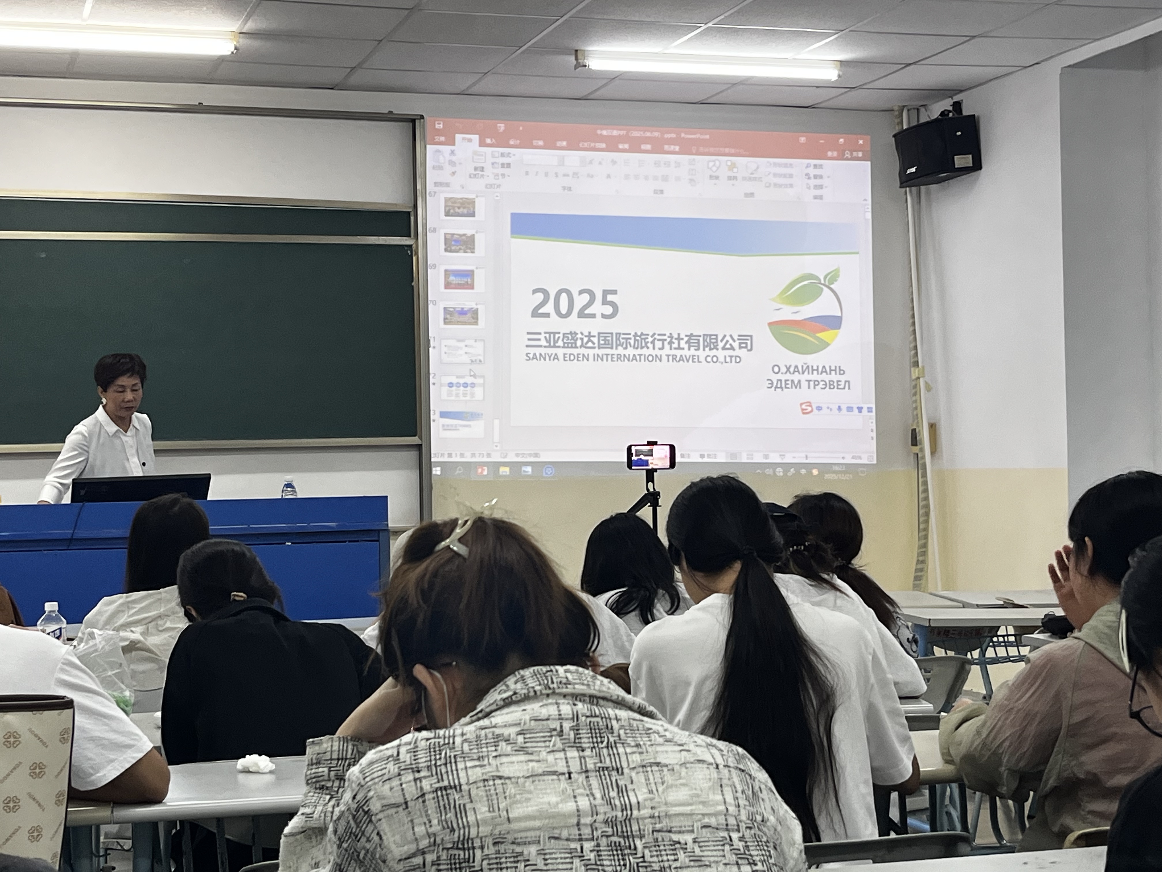 近日,为深化产教融合,助力俄语专业学生对接行业需求,俄语系组织大二全体学生开展对俄文旅企业交流活动,邀请海南本土对俄文旅龙头企业三亚盛达国旅侯江萍董事长进校园,为同学们带来一场干货满满的行业分享会。