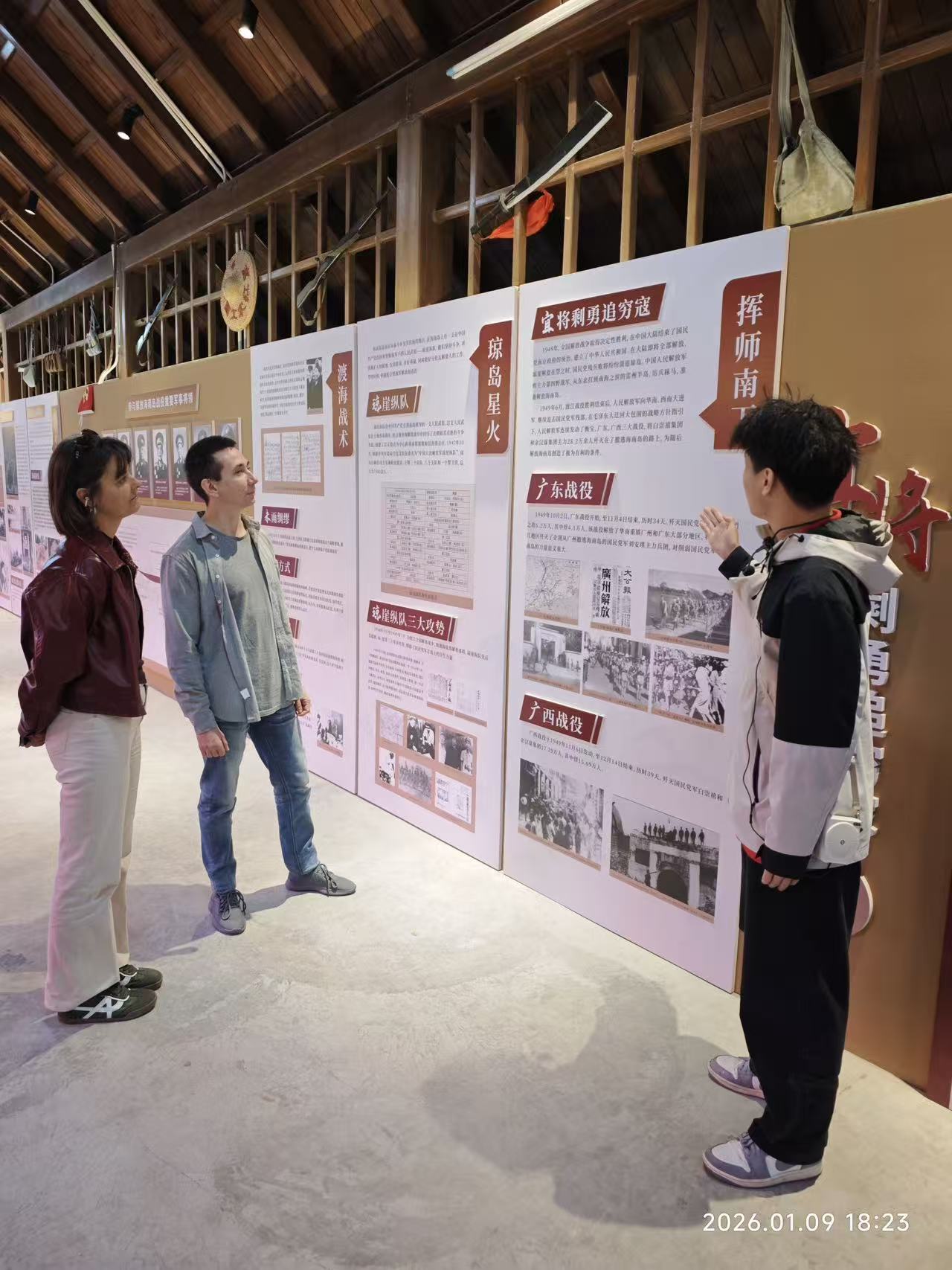 (大三学生为俄罗斯研究生介绍海南红色文化)