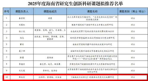 本年度,翻译硕士点师生在省级重点研发项目申报上实现了重大突破。由朴玉明教授指导的学生团队项目《<海南抗日战争志>的英译与历史记忆叙事研究>》成功获批2025年度海南省研究生创新科研课题,该项目不仅体现了翻译硕士点师生对区域历史文化研究的深度挖掘与国际化表达的追求,更将国家重大历史题材的翻译与叙事研究置于研究生培养的重要位置,这一项目的申报获批,标志着我院翻译硕士点在研究生创新科研能力培养上迈上了新台阶,学生不再是知识的被动接受者,而是成为主动的知识创造者和研究者,其思维的广度、深度与创新性,已与本科阶段的学习模式产生显著差异,真正塑造了高层次研究型人才的雏形。