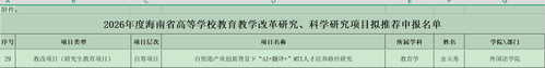 由余玉秀老师牵头申报的《自贸港产业创新背景下“AI+翻译+”MTI人才培养路径研究》获学校推荐2026年度海南省高等学校教育教学改革研究项目。该课题的获批,标志着我校MTI教育在改革创新上迈出新的一步,不仅有力驱动教学理念更新与跨学科融合,为教师提供科研反哺教学的实践平台,同时将催生“AI赋能、产业导向”的MTI培养新模式,显著增强学生在AI翻译、产业应用等方面的核心竞争力,有助于培养高层次复合型翻译人才。同时该项目紧密对接自贸港发展战略,将有力推动学科建设与区域经济发展深度联动,提升学校在翻译教育领域的声誉与影响力,为国家及地方战略需求贡献力量。