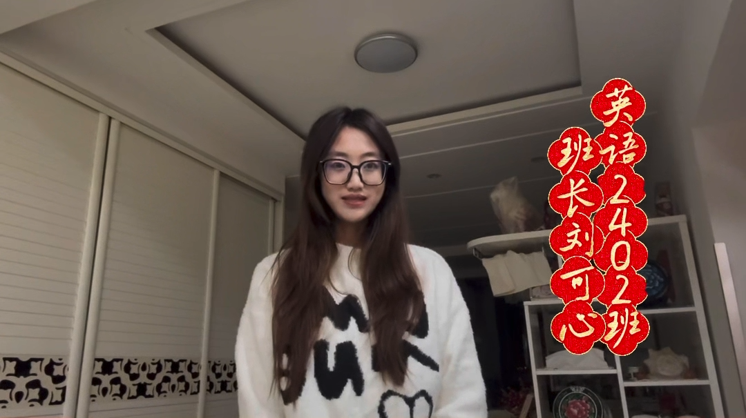 尊敬的老师们,亲爱的同学们,大家好,我是英语2402班的班长刘可欣。马年到来,祝福大家在新的一年里能够平平安安,顺顺利利,也祝福同学们能够在新的一年里取得自己的理想成绩,完成自己的目标,成为自己想成为的人。最后,祝愿老师们身体健康,工作顺利,祝福我们在新的一年里都能够做好自己,成为自己心中理想的模样。