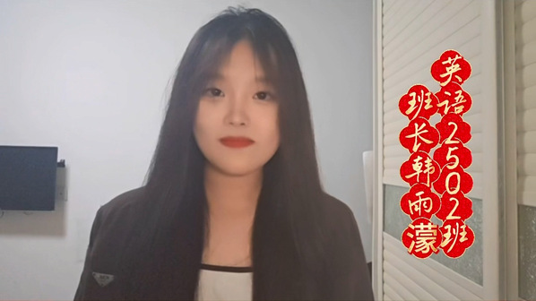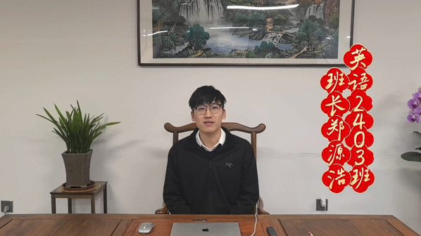 大家好,我是三亚学院外国语学院英语专业英语2401班班长秦一森。正值新年,我想在这里祝大家新年快乐,祝老师工作顺利,祝同学们学业有成,步步高升,祝大家欢愉且胜意,万事皆可期。