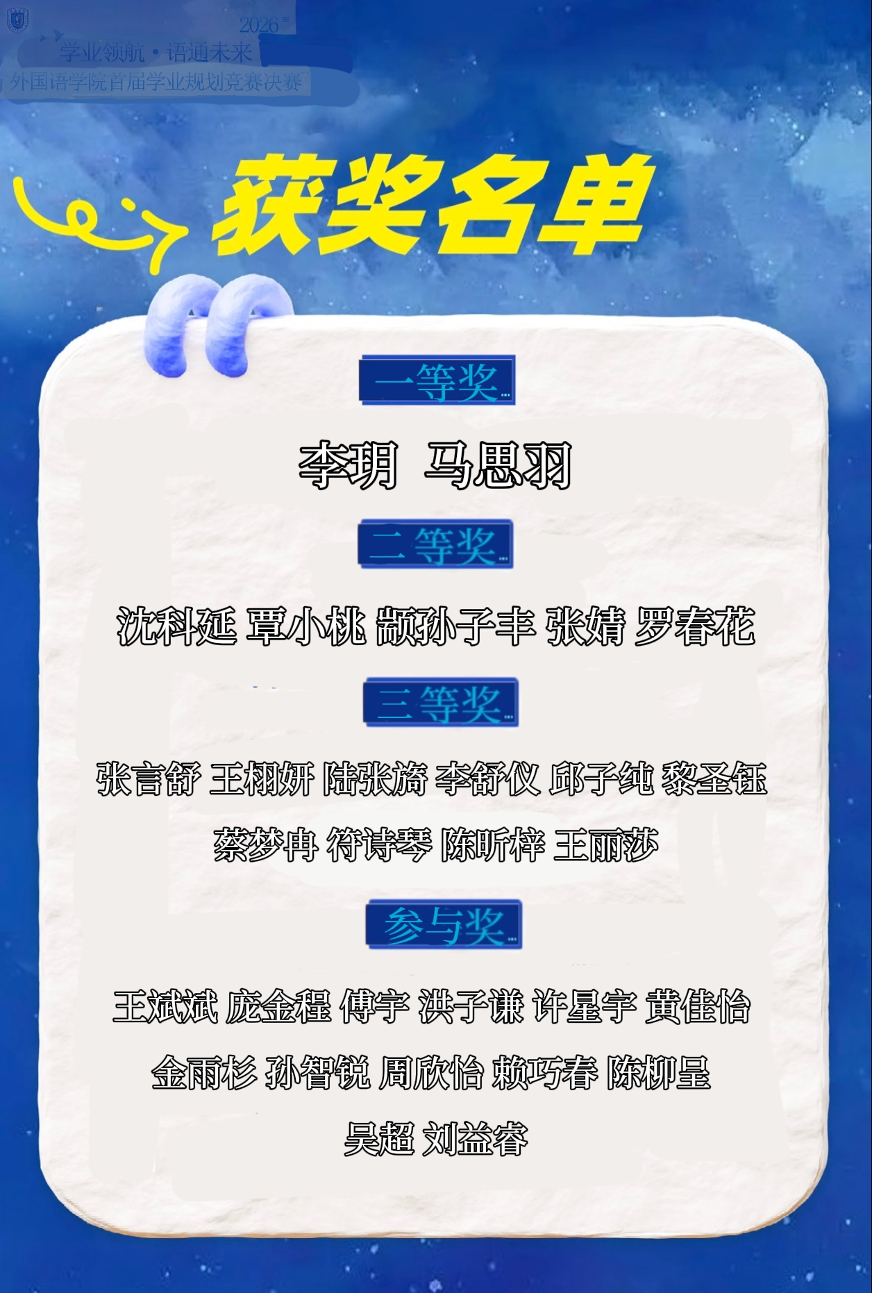 竞赛的圆满落幕,是一次青春规划的成果检阅,更是一场跨域成长的全新启航。未来,我院将持续以“学业领航·语通未来”为核心抓手,完善全周期学业指导体系,深耕跨学科融合育人模式,搭建更多元的成长平台,让每一位学生在规划中积蓄力量,在跨界探索中成就自我,成长为兼具语言优势与全球视野的复合型人才,书写属于自己的青春华章。